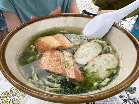 麺に練り込まれたアーサ、もちろんスープにもたっぷり、トッピングのかまぼこにも、という徹底ぶり。