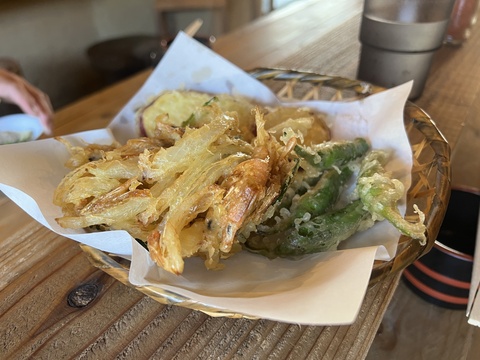かき揚げとイモにシシトウの天ぷらを。素麺の付け合せはとても上品な天ぷらでした、もちろん美味!